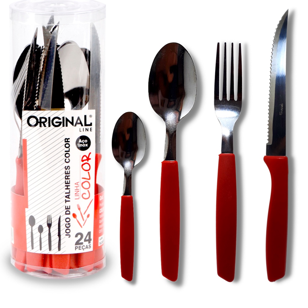 Jogo De Talheres Faqueiro Inox Preto Vermelho 24 Peças Resistente Faca Garfo Colher