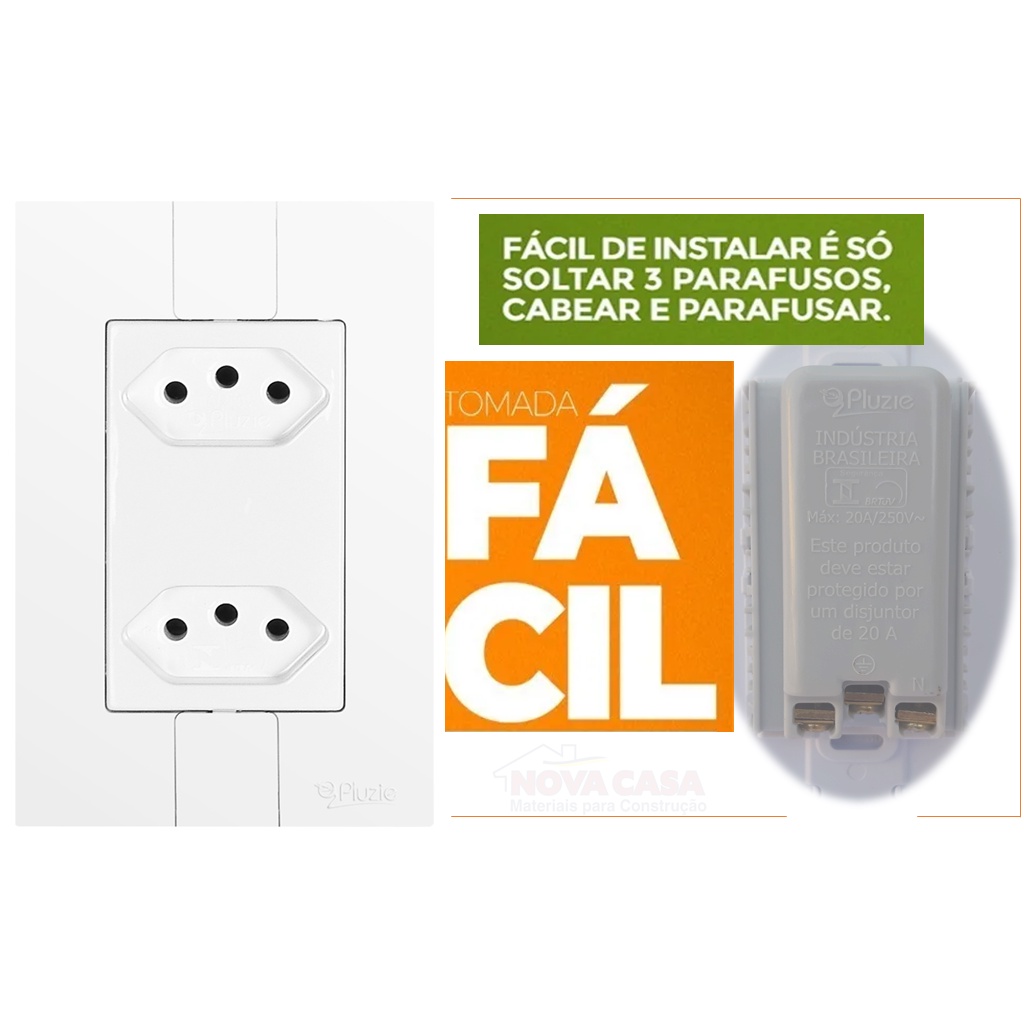 Tomada Tripla Modular 10A 20A Linha Fácil 2P+T Pluzie - 3 Tomadas Monobloco