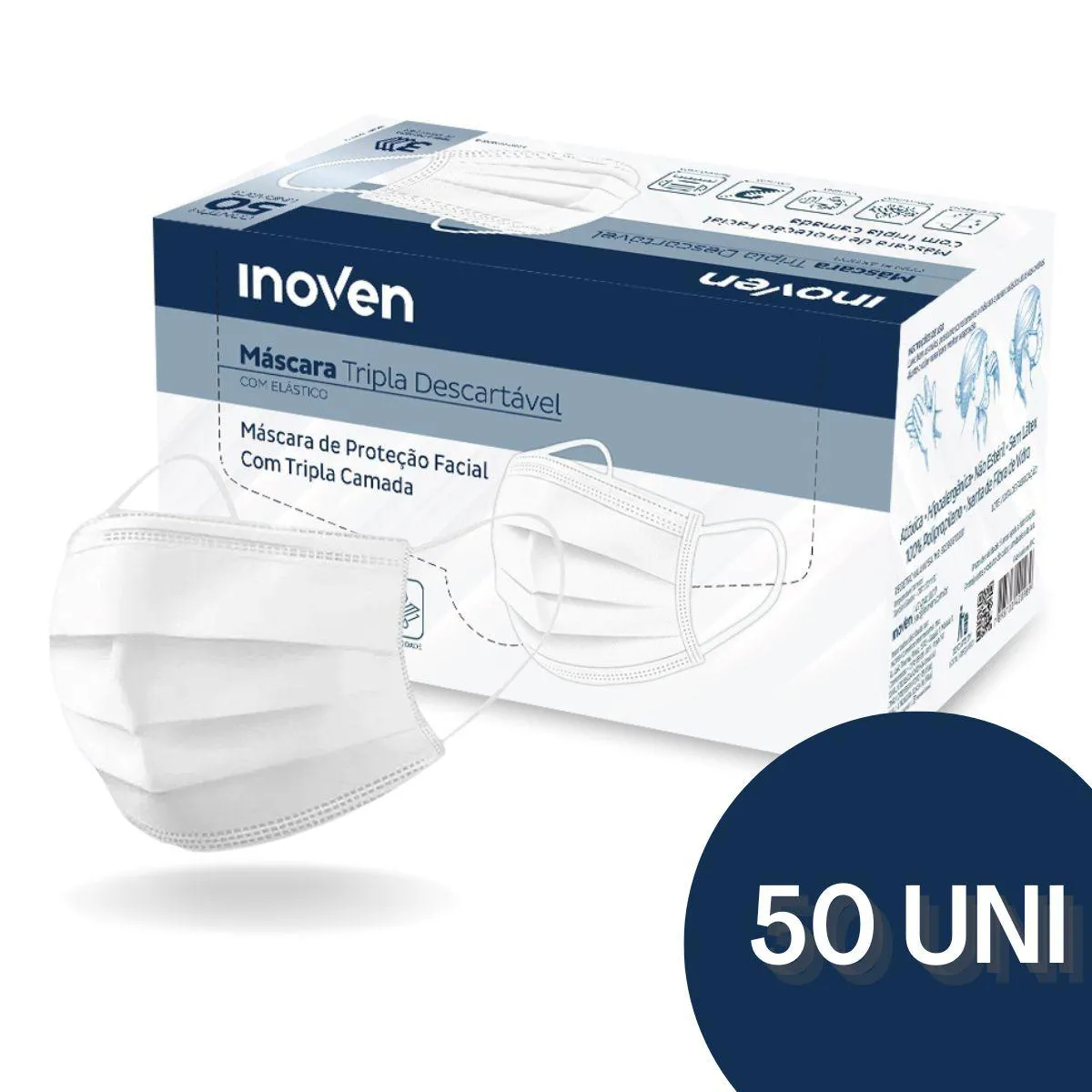 MÁSCARA DESCARTÁVEL BRANCA FACIAL TRIPLA CAMADA C/ 50 Unidades