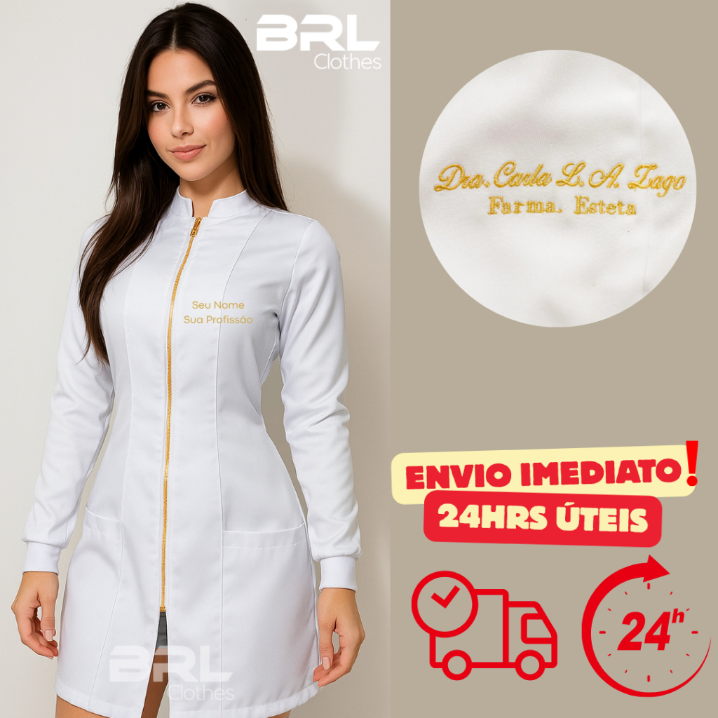 Jaleco Feminino Branco Zíper Dourado Personalizado – BORDADO Nome e Profissão Inclusos SOMENTE ESCRITA – BRASÃO A PARTE.