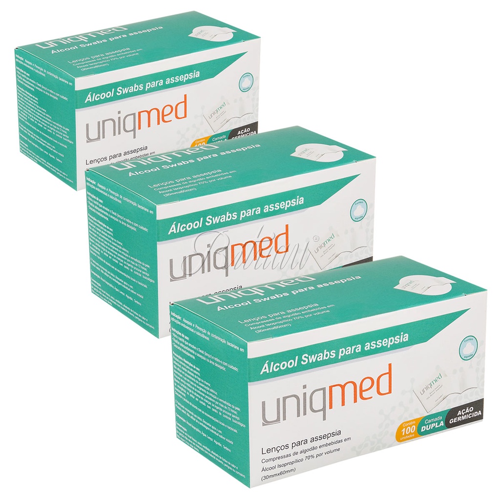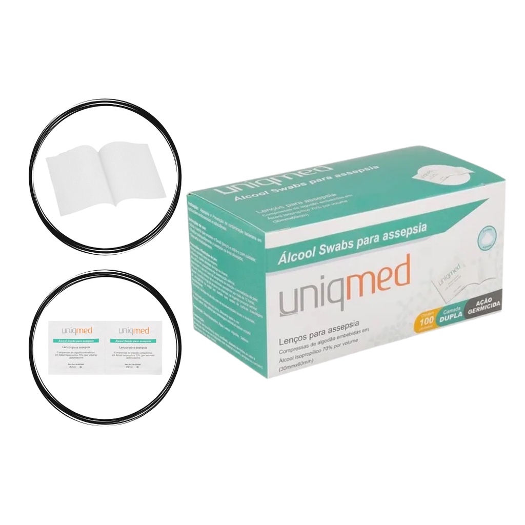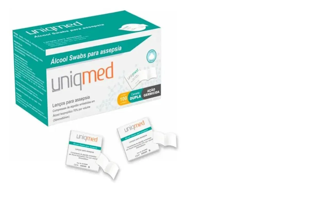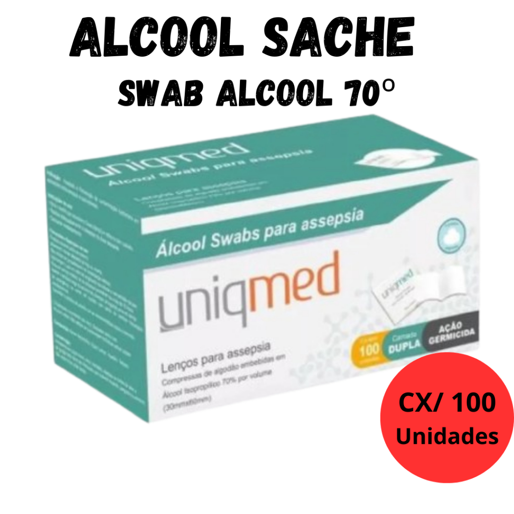 ALCOOL SWABS 70% SACHES LENÇOS UMEDECIDOS PARA ASSEPSIA UNIQMED 100 UNIDADES