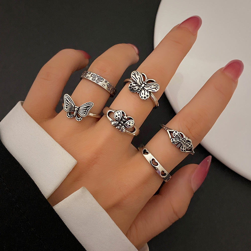 Conjunto de Anel Conjunto Europeu Americano de Borboletas Retro Esculpidas em Punk Style Hip Hop Heart 6-Piece Combination Jewelry