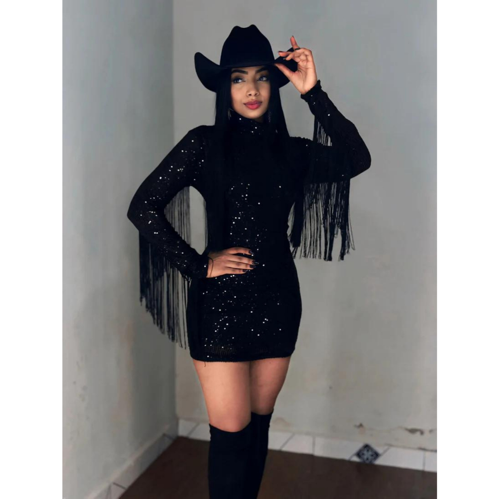 Vestido feminino manga longa de franja gola alta c/ zíper moda balada country festa pecuaria inverno