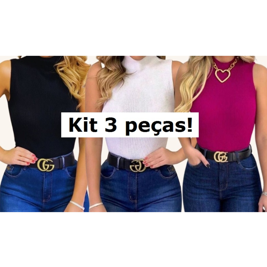 Kit C/ 3 Blusinha Feminina Garrafinha Tricot Gola Alta Canelado