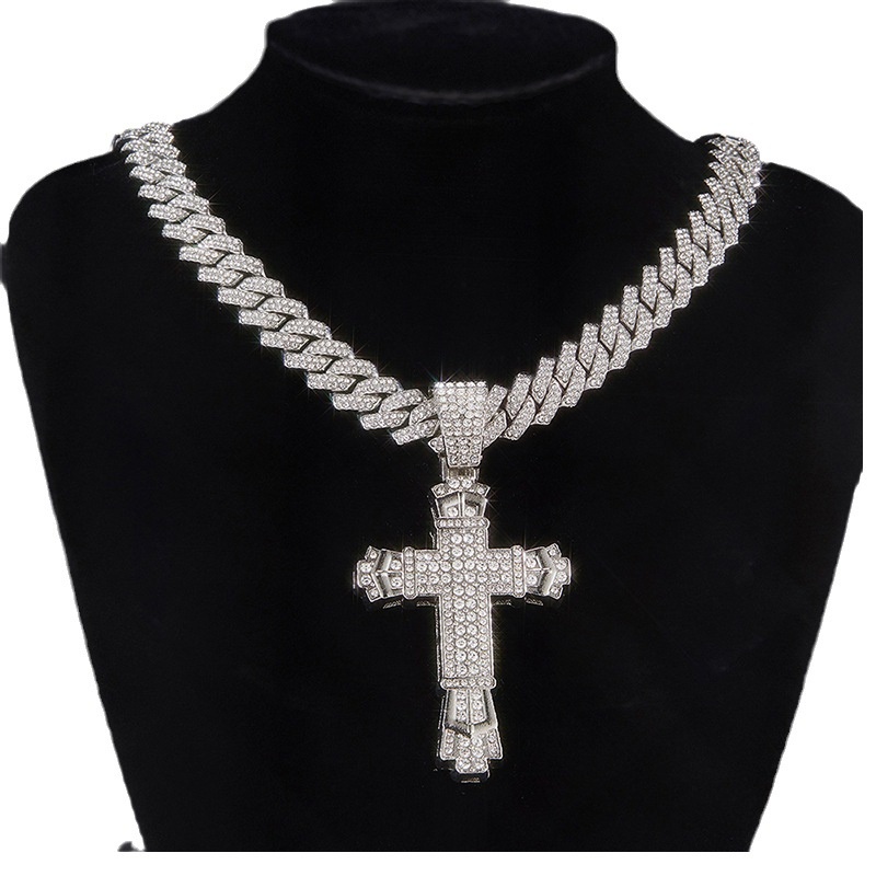 MYSUNSHINY Colar de 50cm de diamante em cruz grande com corte diamantado Colar Europeu Americano de Liga Liga de Rhinestone Exclusiva All-Match Homens Mulheres Mesmo Estilo Colar de Corrente Cubano