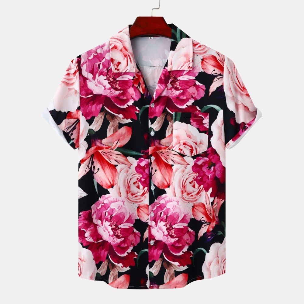 2024 Nova Camisa Floral De Manga Curta Havaiana Para Homens De Praia Casual Solta Rosa Impressa De Botão De Colarinho Cubano
