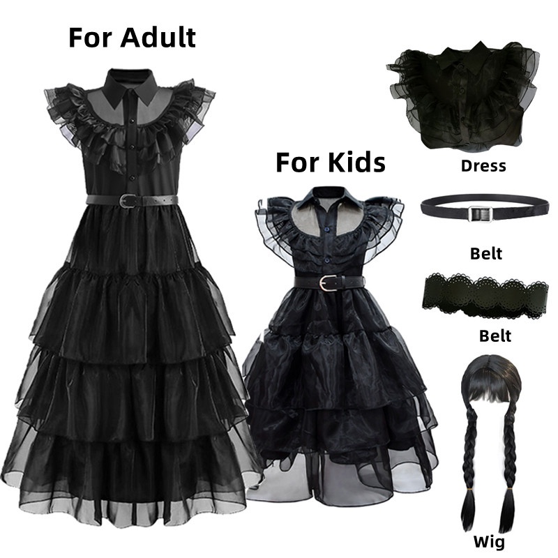 Filme Quarta-feira Cosplay Vestidos Quarta-feira Addams Cosplay Traje Vento Gótico Adulto Crianças Vestido Trajes de Festa de Halloween