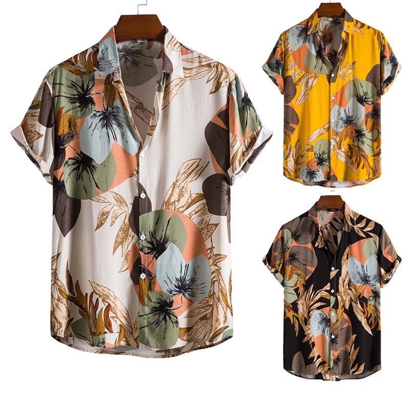 Camisa Floral Masculina Havaí Manga Curta Verão Praia Casual Botão Para Cima Lapela Retro Camisas De Algodão