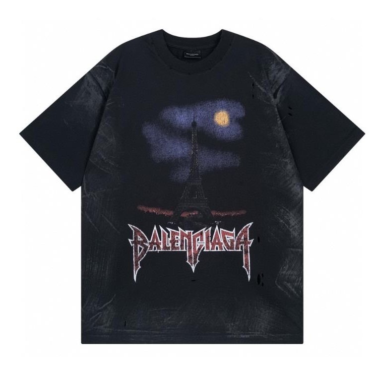 Paris novo estilo torre Eiffel jato de tinta Graffiti pintado à mão gradiente cor impressão lavado angustiado destruição de manga curta