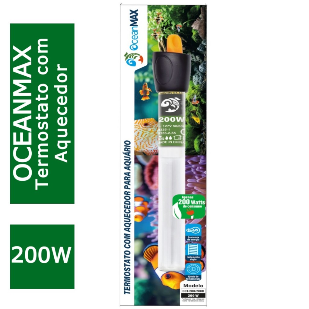 Termostato Aquecedor para aquário 200W OceanMax - Para Aquários até 220 litros
