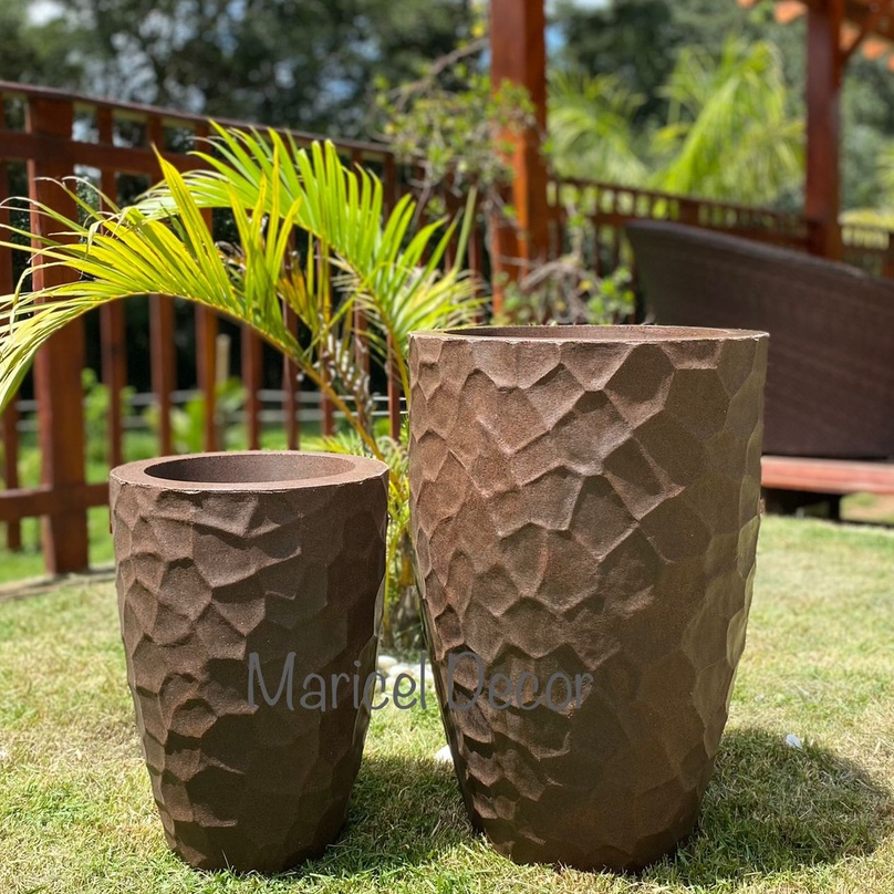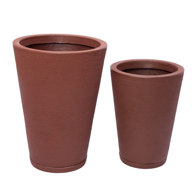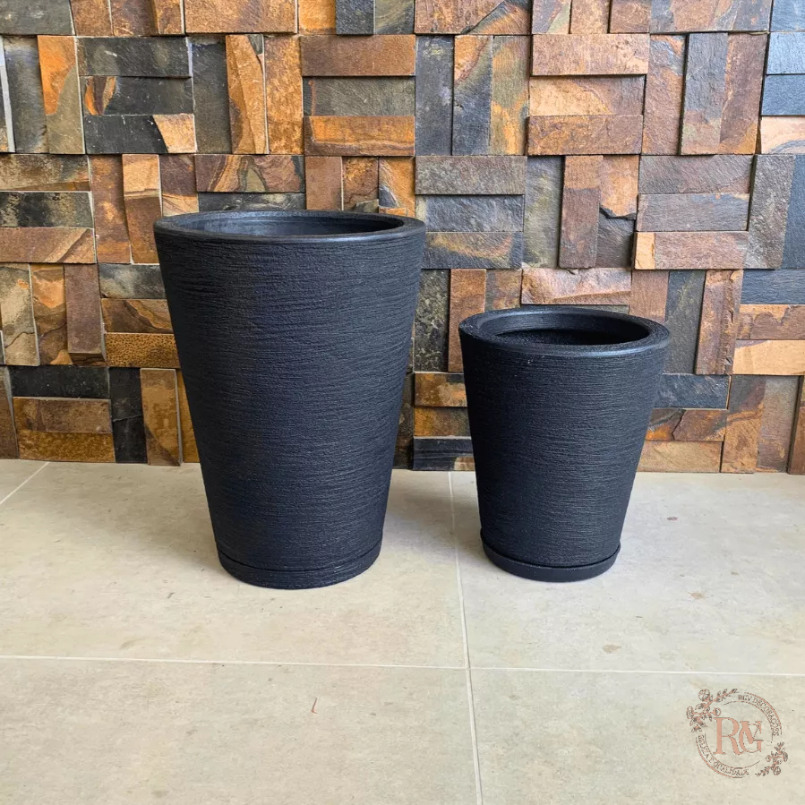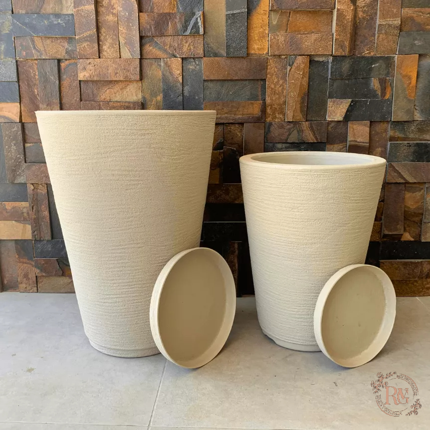 Kit 2 Vasos de Plantas Decorativo Polietileno Coluna Redonda Cone Texturizados Nº1 Nº2 Com Prato