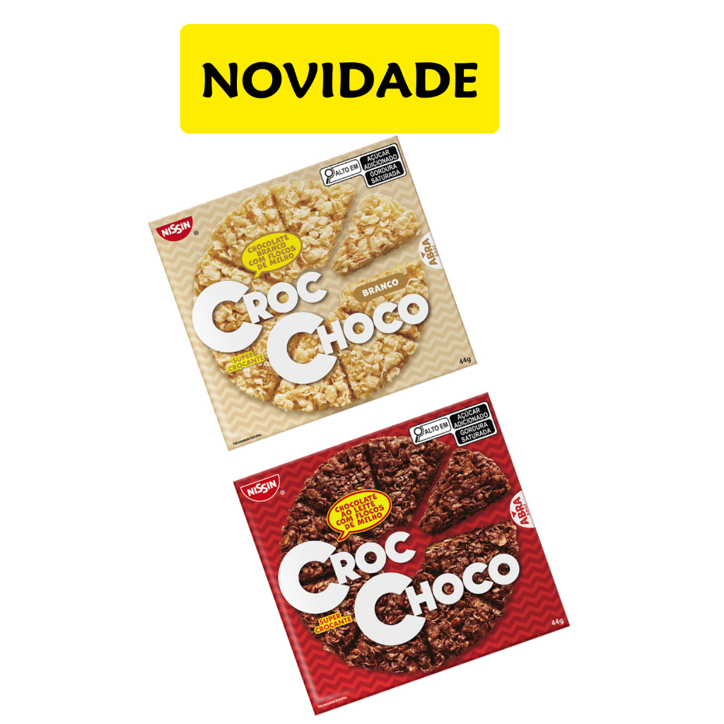 Kit caixa nissin Croc Choco Nissin 44g – 1 Unidade Chocolate Branco + 1 Unidade Chocolate Ao Leite com Flocos de Milho