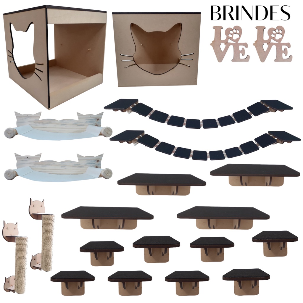 Playground para Gato 11 peças Circuito de Gatos combo Arranhador sisal + rede suspensa caminha nichos ponte degraus prateleiras MDF