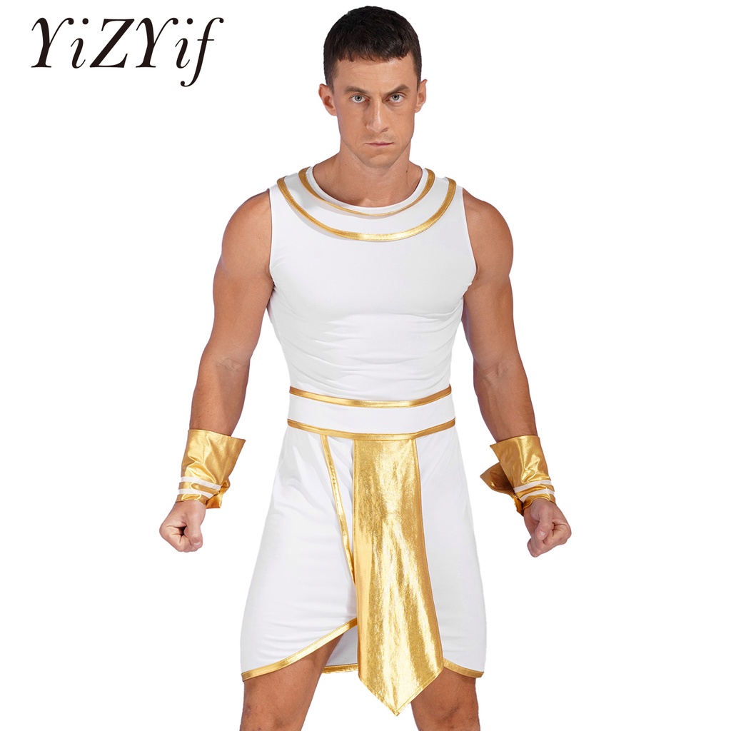 Traje Faraó Homem Adulto Antigo Egito Rei Cleópatra Roupa De Jogo De Papel Sem Manga + Conjuntos De Algemas Para Mascarada De Halloween