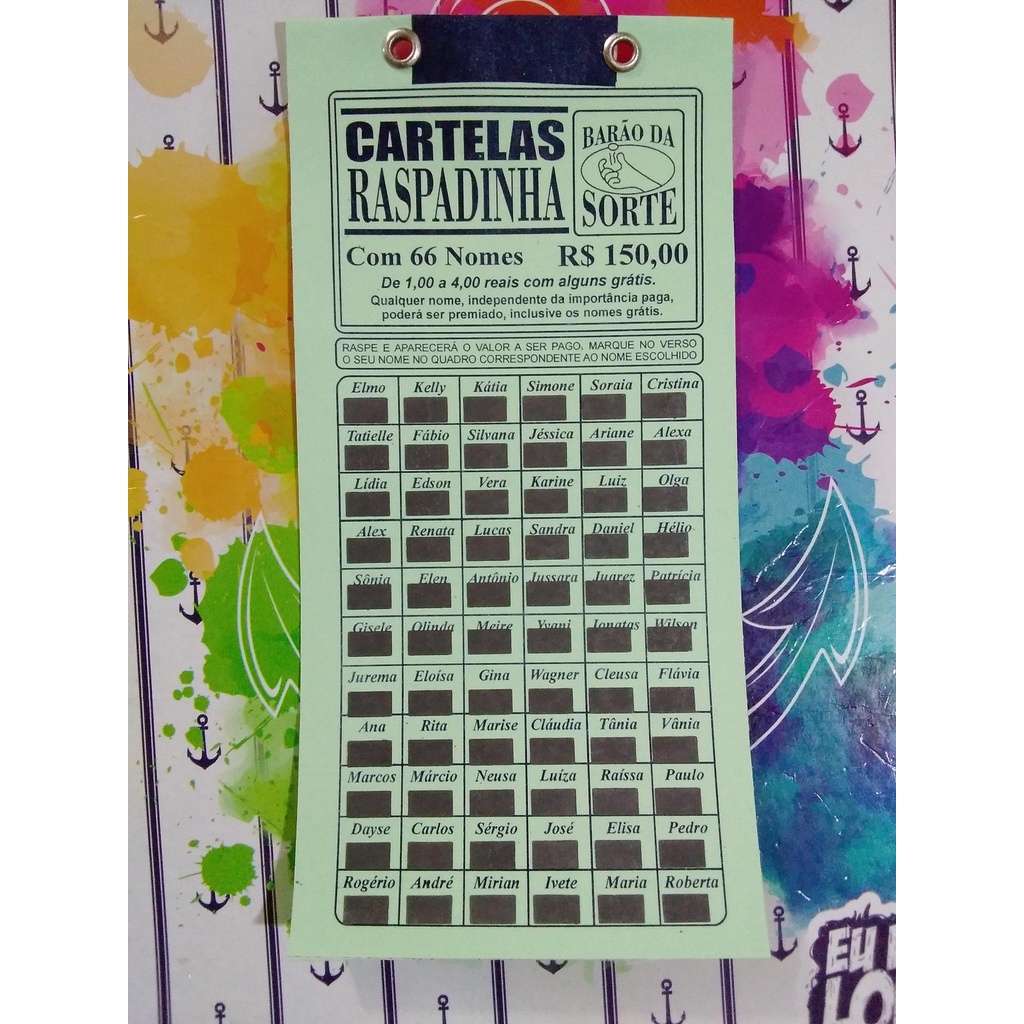 Cartela de Rifa 66 nomes valor pré determinado R$ 150,00 de arrecadação Pct. com 10 unidades