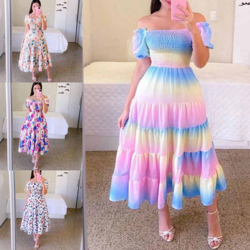 Vestido Feminino Estampado Princesa Três Marias Lastex Ombro a Ombro Moda Evangélica
