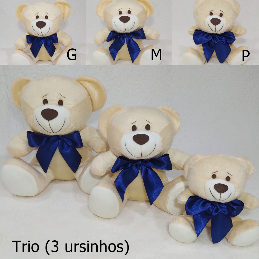 Urso de Pelúcia Avulso ou Trio Com Laço Menina/Menino Decoração Quarto Nicho Bebê Azul Marinho P/M/G