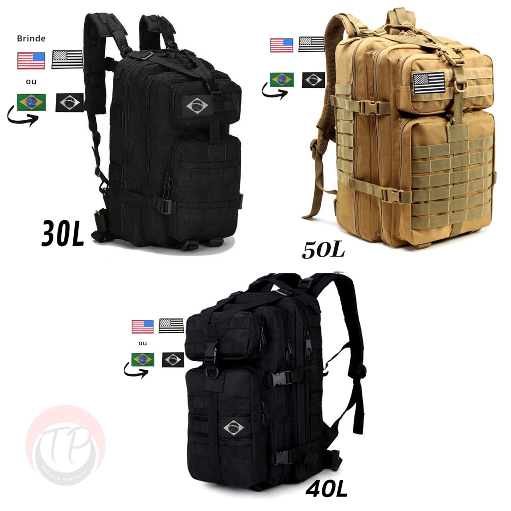 Mochila Tática 30L/45L/50L Militar Impermeável Reforçada Com Patch Bandeira