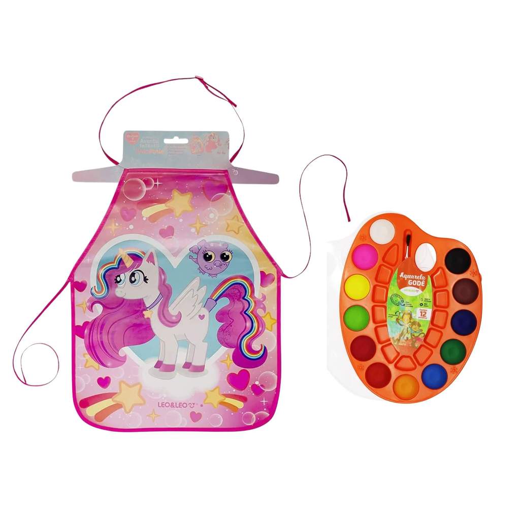 Kit Escolar Criativo Leo&Leo Avental Infantil Unicórnio + Estojo Aquarela Gode 12 Cores Pintura Arte