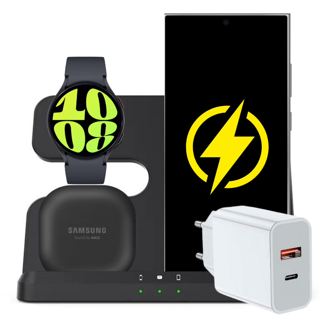 Kit Carregador Indução Sem Fio 3 em 1 Para Samsung S24 + Watch 6 + Earbuds - Com fonte PD