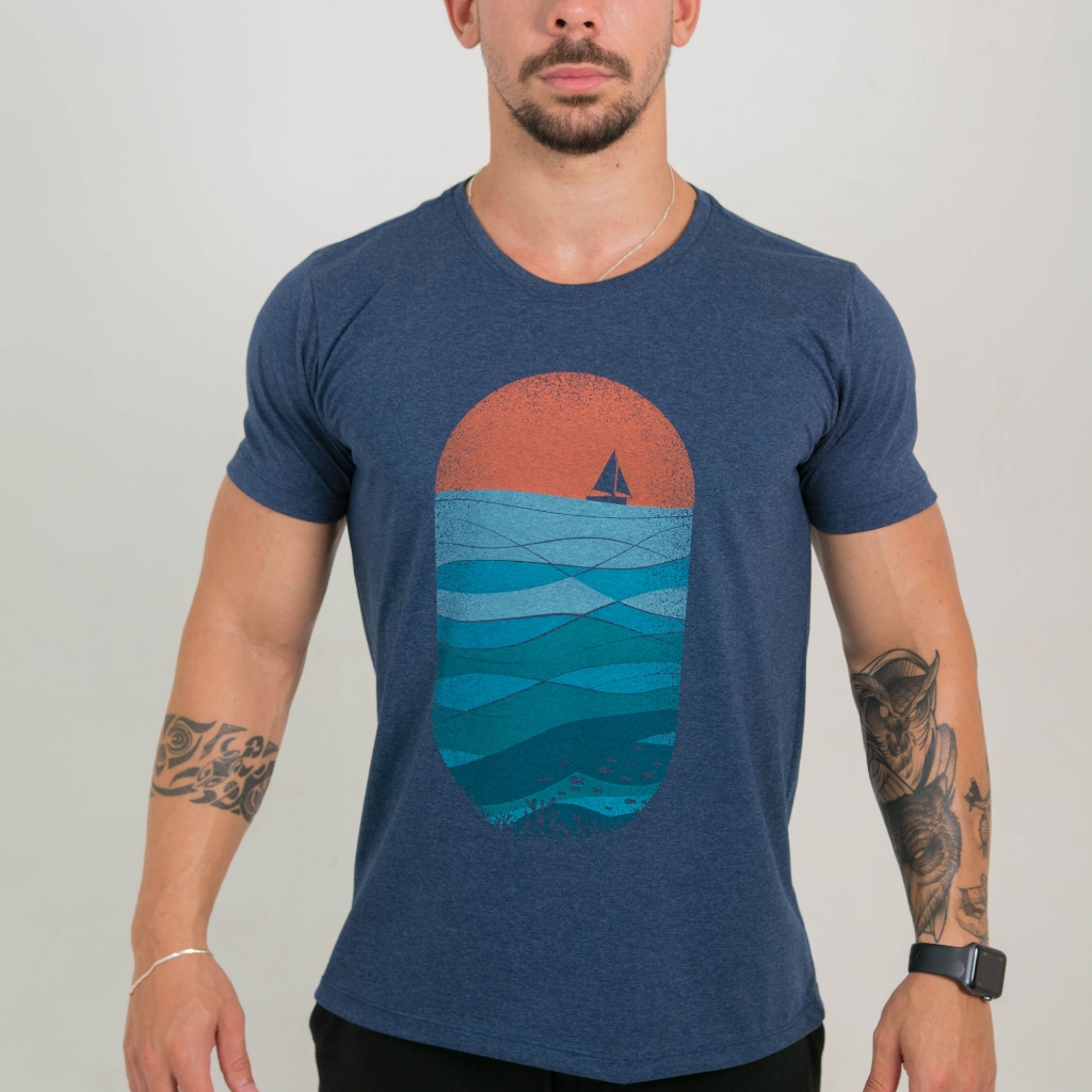 Camiseta Masculina Estampada Barco Gola Redonda em Malha de Algodão Premium