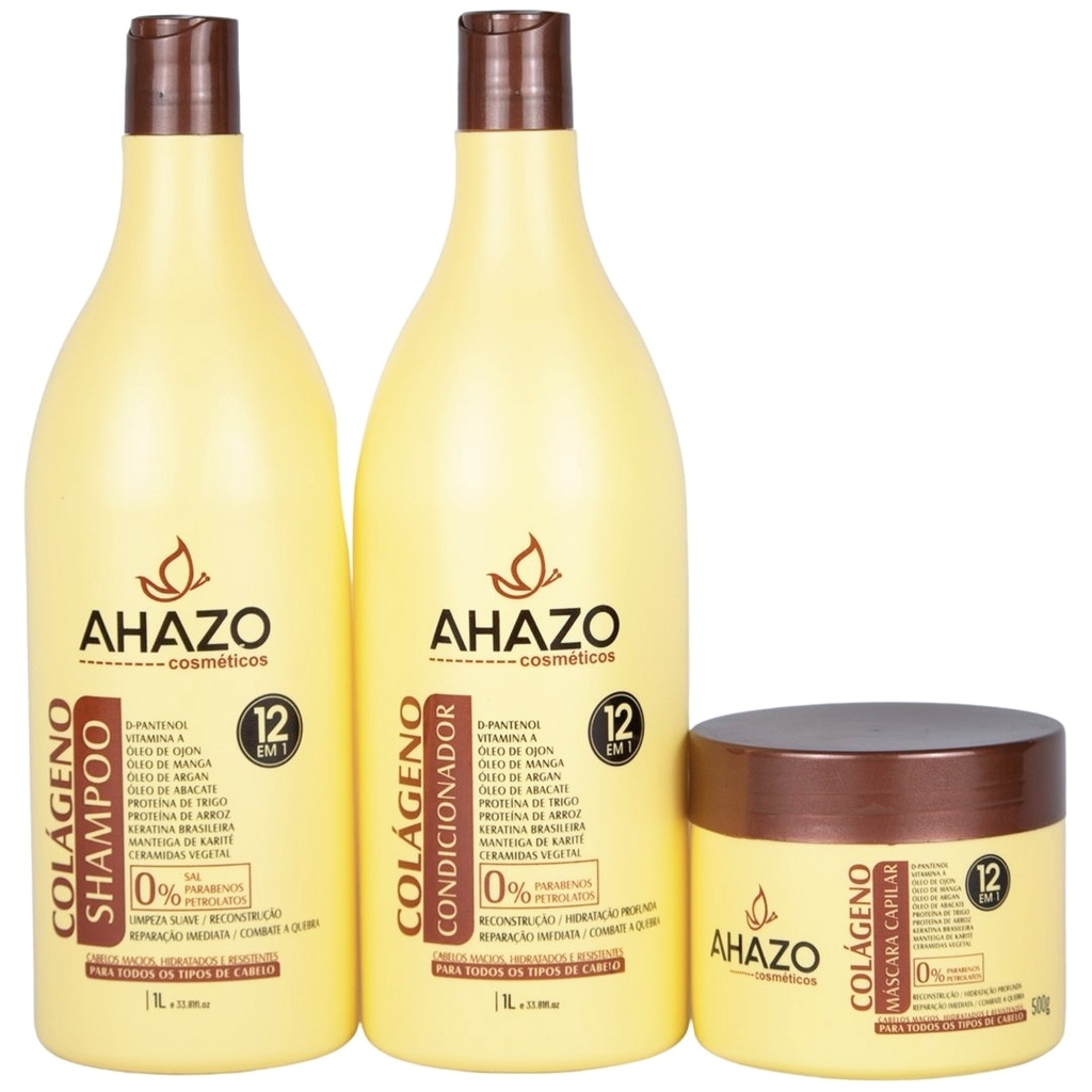 Kit colágeno 12 em 1 da AHAZO. Tratamento com shampoo, condicionador e máscara de hidratação.