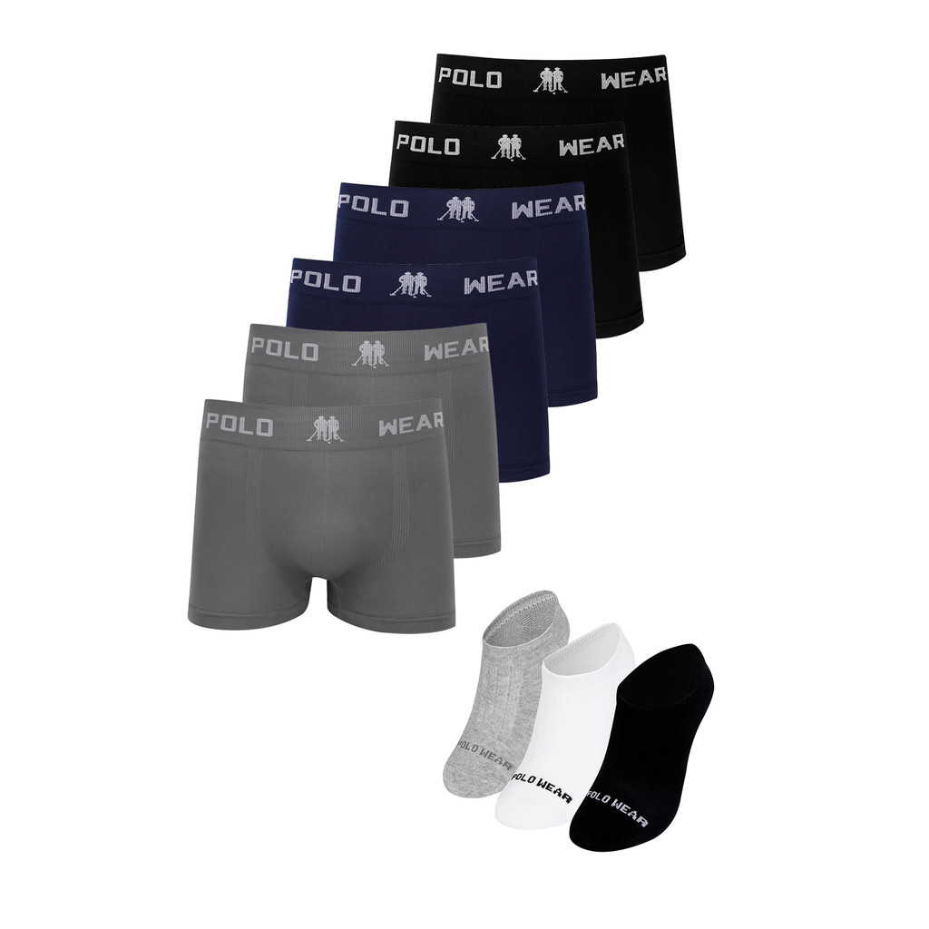 Kit 6 Cuecas Boxer e 3 Pares Meias Invisíveis Polo Wear Sortido
