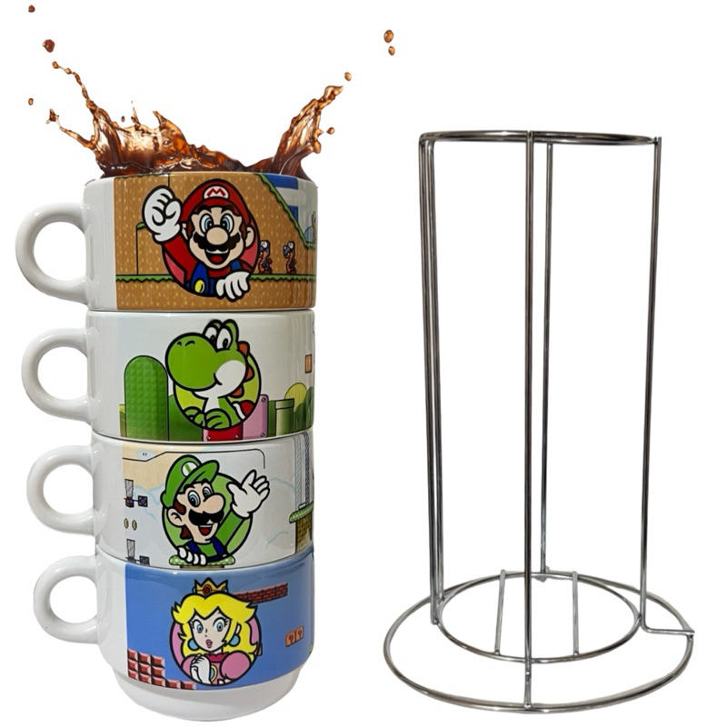 Kit Jogo de Xícaras para Café Super Mario Bros Conjunto com 4 Caneca + Suporte 150ml