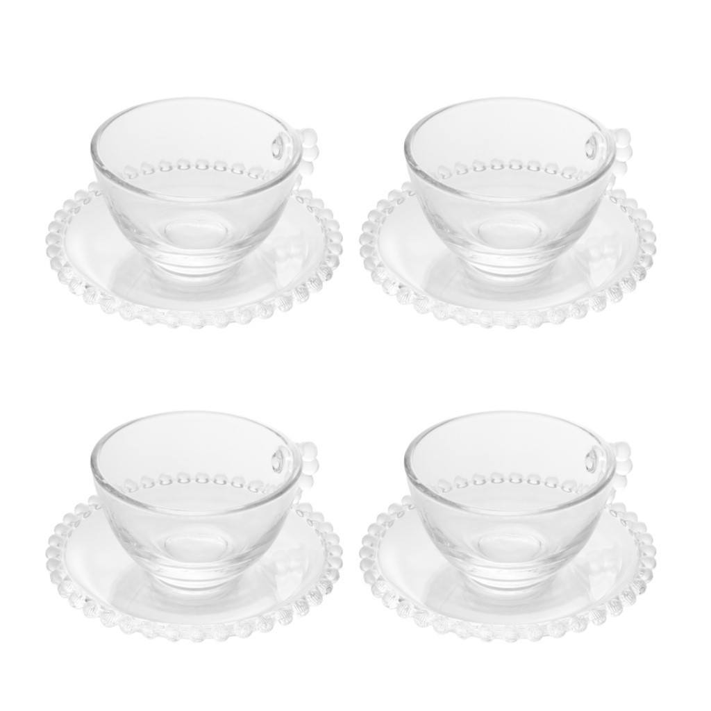 Kit Jogo 4 Xícaras 180ml de Chá Café Grande com Píres Redondo de Cristal Pearl Bolinhas Wolff Transparente