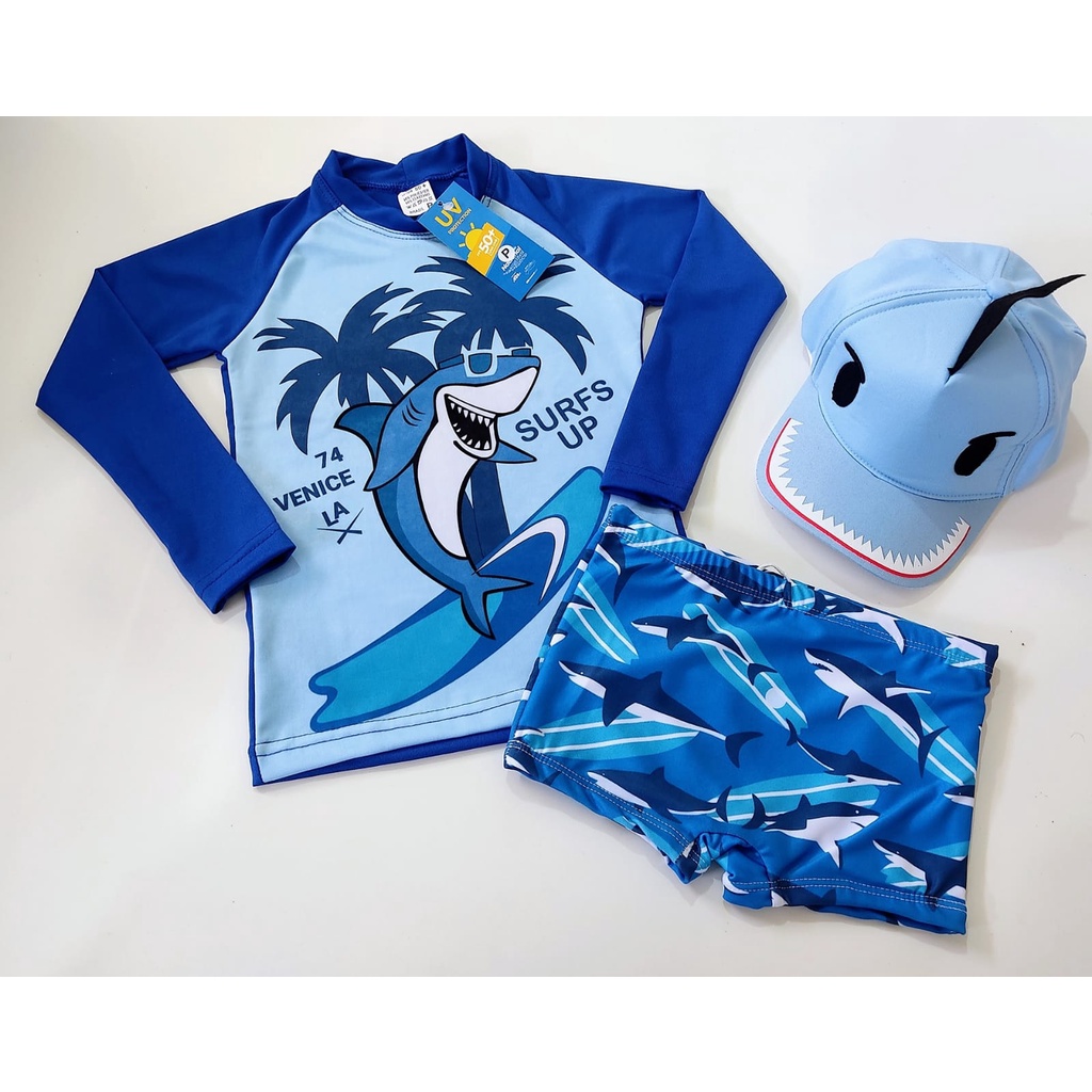 Conjunto Sunga Infantil + Camisa UV + BONÉ para Meninos Proteção Solar Criança Praia