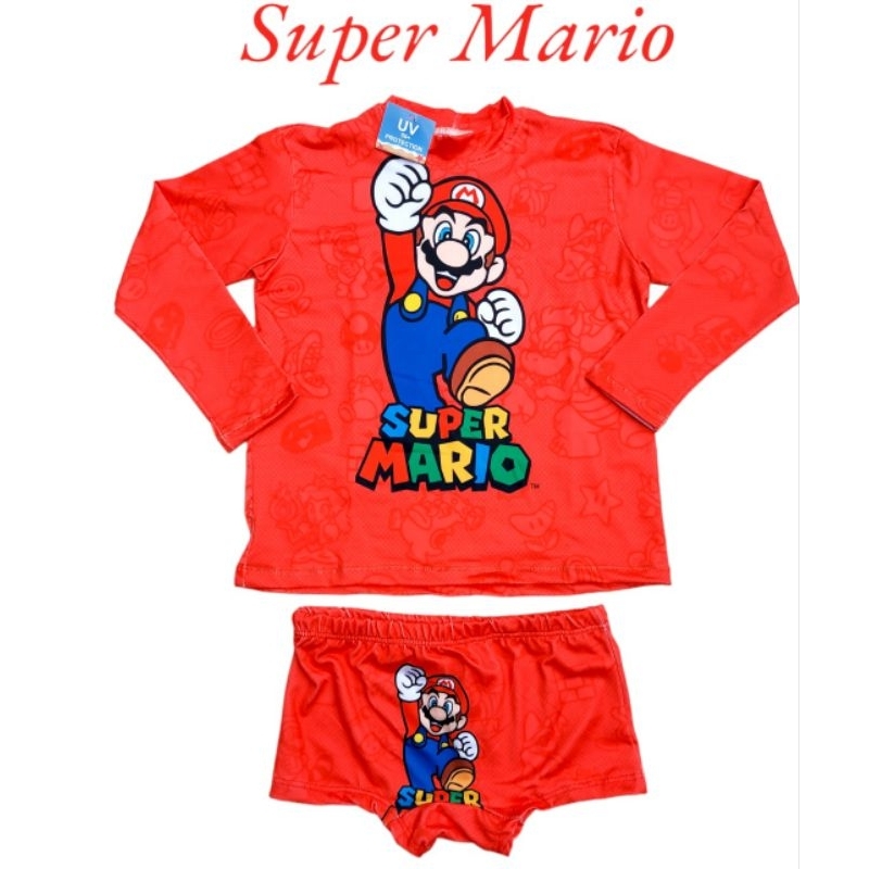 Conjunto UV proteção solar Camisa+sunga piscina/praia Personagem infantil Super Mario