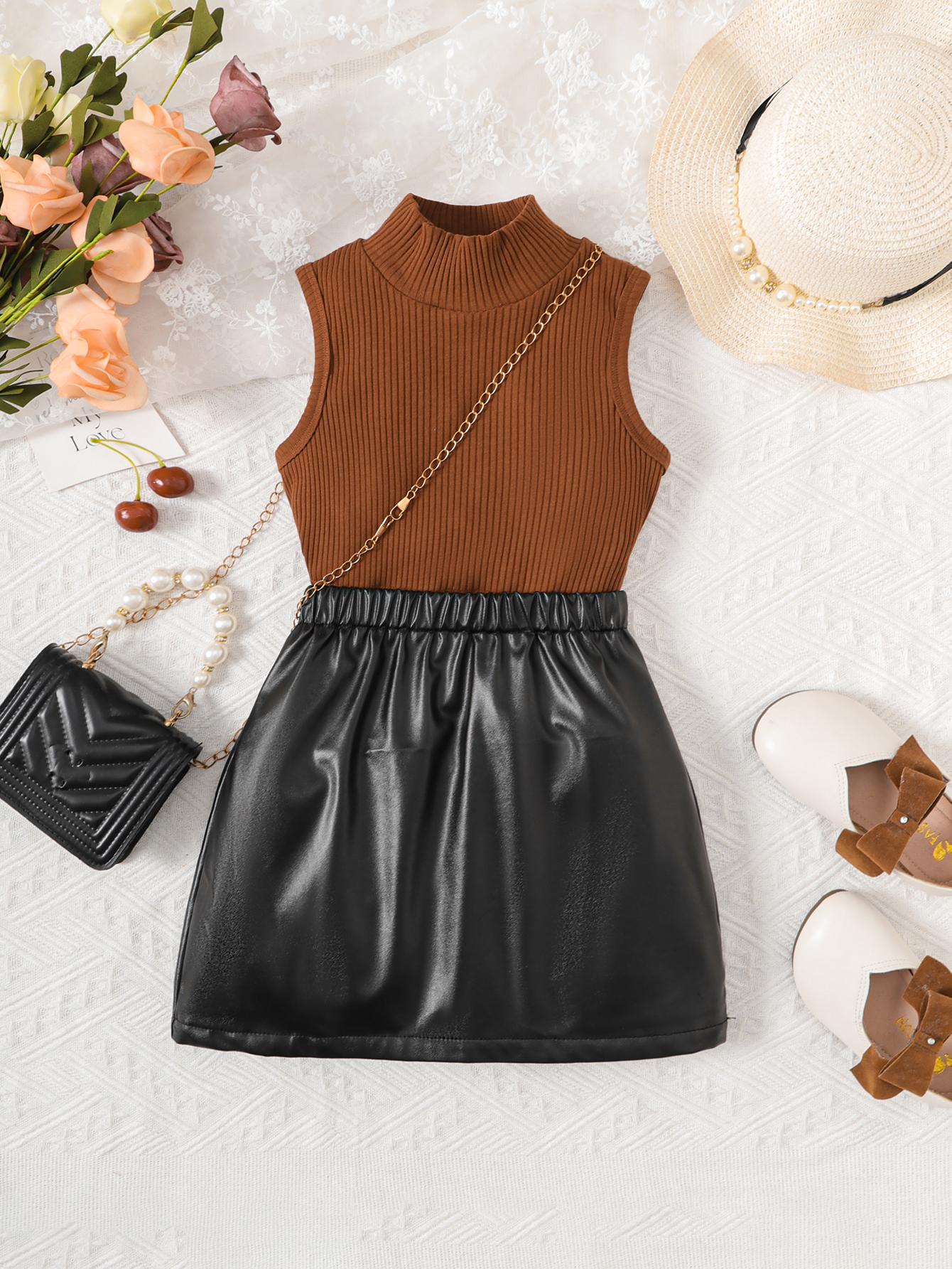 2-7 Anos Roupas Para Meninas Moda Infantil Festa De Aniversário Clotrhing Set Camiseta Sem Mangas Sólida Saia PU 2PCS Traje De Verão