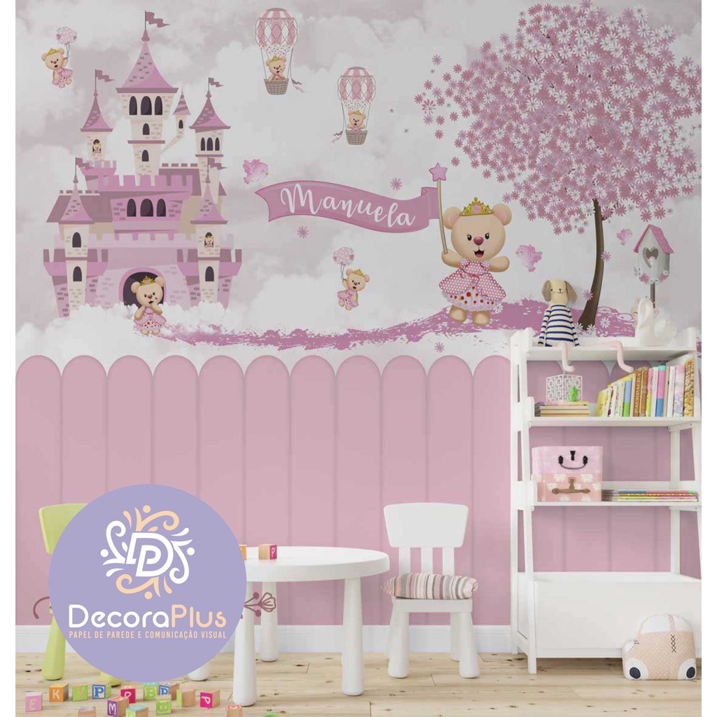 Papel de Parede Foto Mural Adesivo Autocolante Nome Personalizado Infantil Fantasia Ursinho Princesa Rainha Da Casa Urso Roda Meio Palitos Rosa e Branco Árvore Sakura Criança Menina Quarto Aniversário M² Imagem Completa