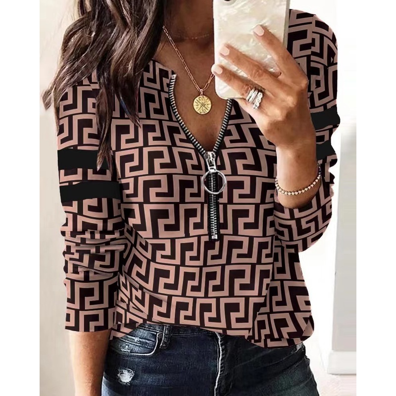 Casual Manga Longa Camisetas Femininas Com Decote Em V 2022 Primavera Outono Moda Estampa Blusas