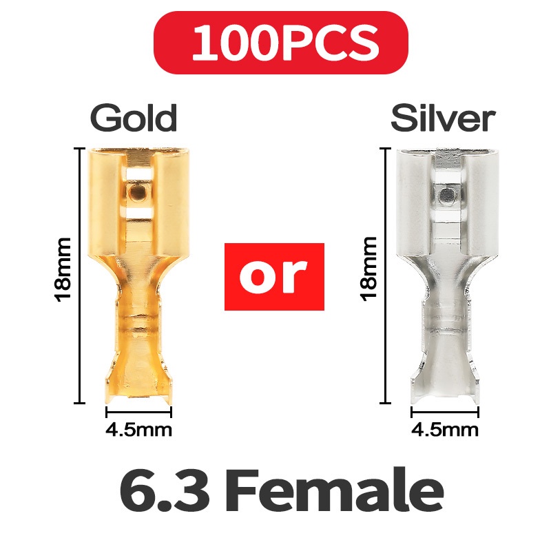 QEESHOW 100 Pçs/Lote 6.3mm Macho E Fêmea Spade Crimp Terminais De Bronze Ouro/Prata Altofalante Do Carro Conectores De Fios Elétricos