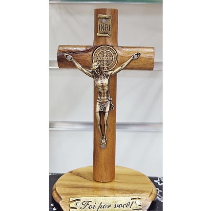 Crucifixo Em Madeira Com Base Para Mesa ou Parede medalha de São Bento madeira imbuia.