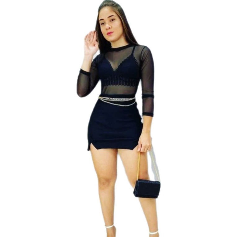 Conjunto com kit composto de quatro (4) peças, blogueira, short saia, cropped, body tule, cinto corrente COD05