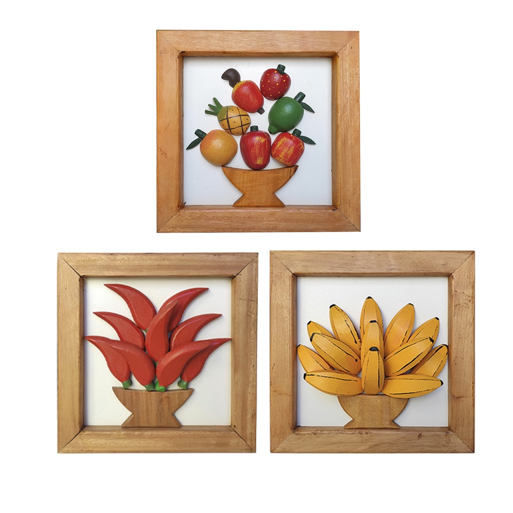 Conjunto Kit Quadro De Banana Pimenta e Frutas Artesanal Escultura Alto Relevo De Parede Pequeno