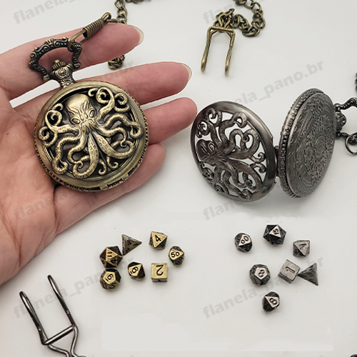 Conjunto de 7 Dados Poliédricos de Metal em Bronze com Caixa Oca de Polvo, Relógio de Bolso e Corrente para Jogos de RPG