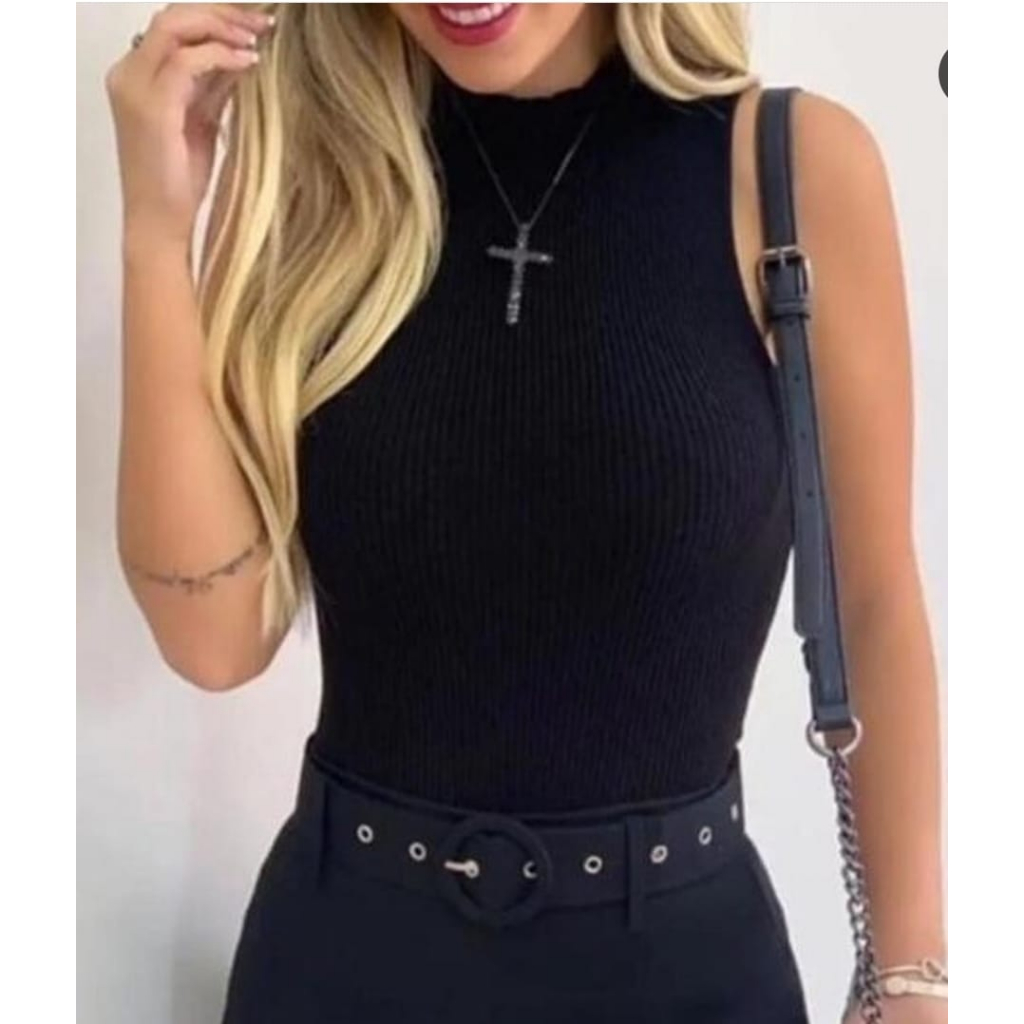 Blusa Feminina Social Para Festa Canelada Gola Alta Cavada Regata Blogueira Com Elastano Lycra