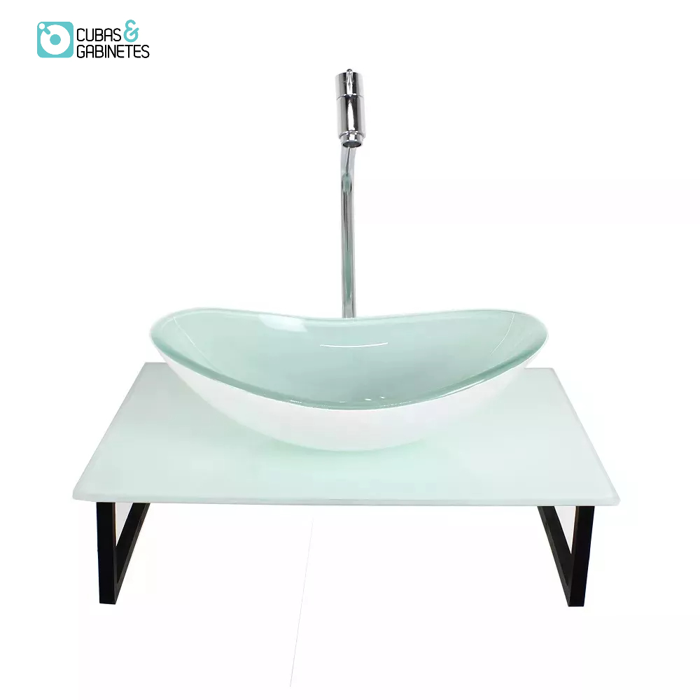 KIT CUBA DE VIDRO OVAL 10MM COM TAMPO 50CM BRANCO FULL E SUPORTE PRETO