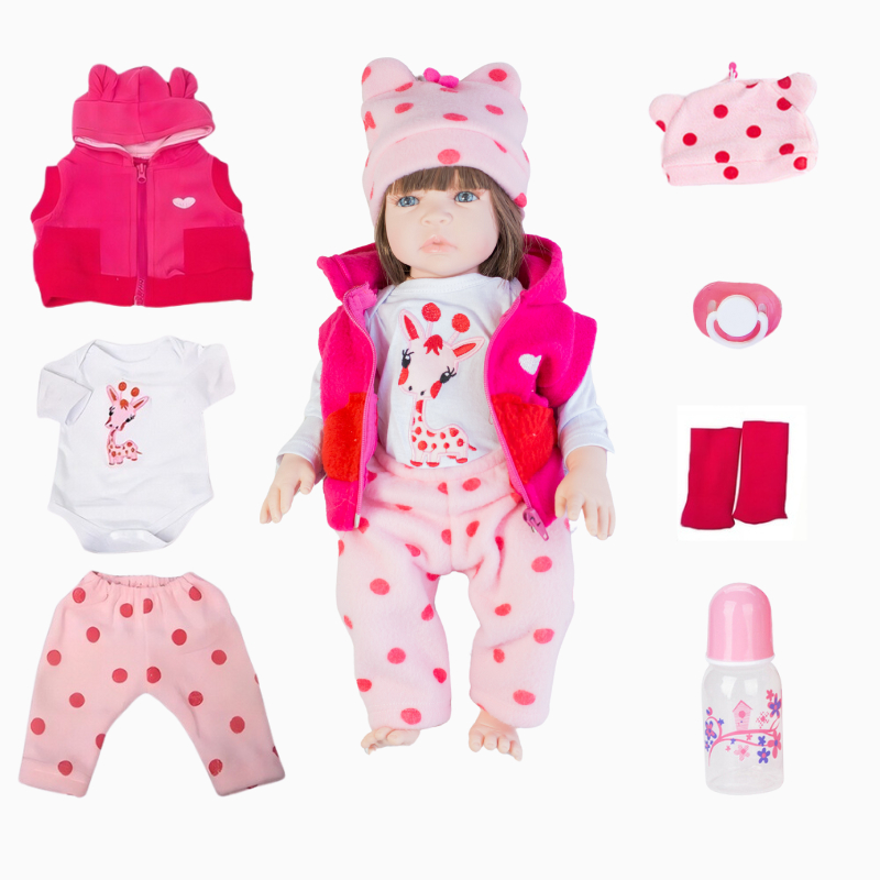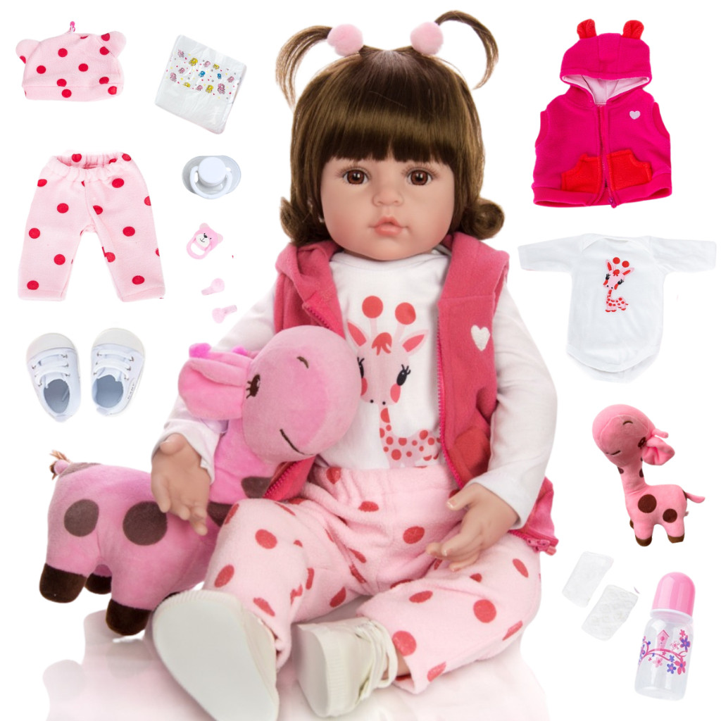 Boneca Bebê Reborn Realista Girafinha Menina de Silicone 48cm Olhos Castanhos (Pode Dar Banho)
