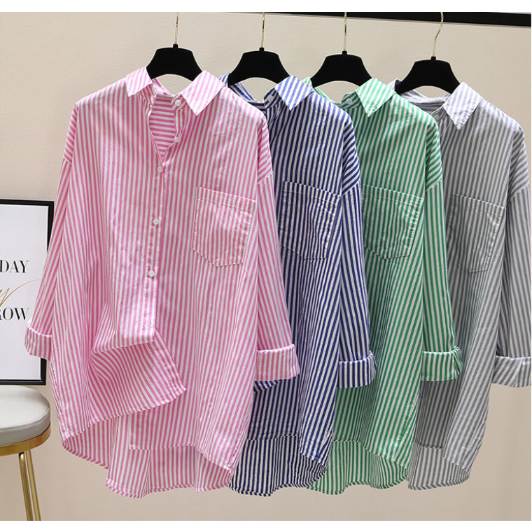 2023 Primavera Outono Novo Estilo Outono Novo Estilo Coreano Frente Literária Frente Curta Costas Longas Camisa Listrada Vertical Média Comprimento Camisa Casual Mulher