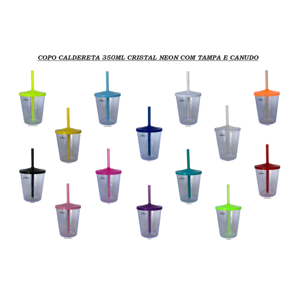 100 Caldereta 350ml Cristal Neon Acrilico com tampa e canudo