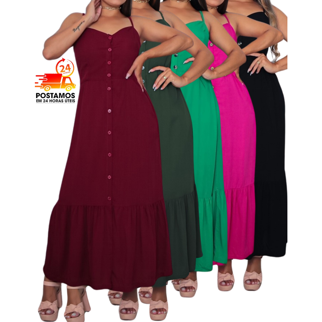 Vestido Liso Longo Com Duas Alça Botoes Laterais Fenda e Costa de Elastec