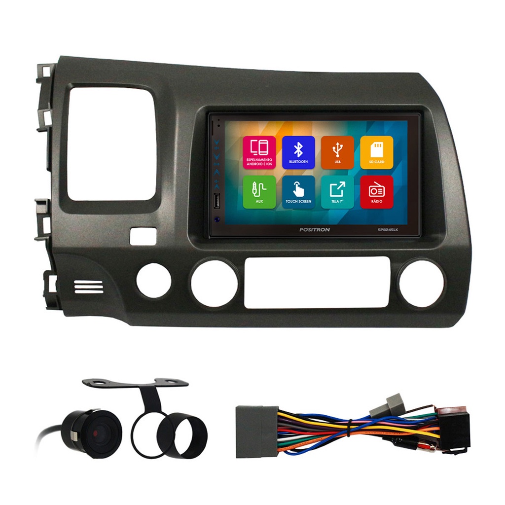 Kit Multimídia Positron 2 Din New Civic 2007 2008 09 2010 2011 6,2 Pol Moldura Grafite Espelhamento Camera Ré Bluetooth