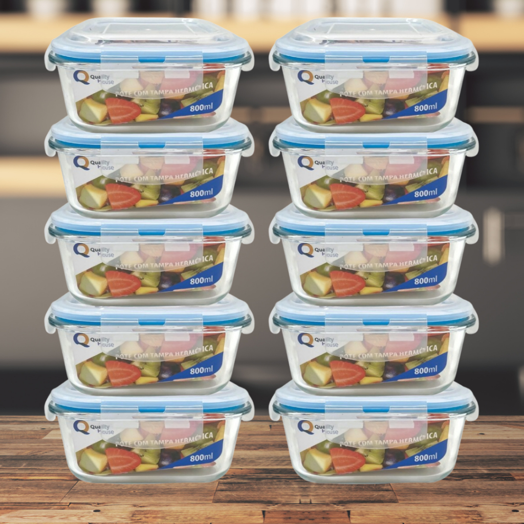 Kit com 10 Potes Hermético Quadrado de Vidro 4 Travas para Marmita 800ml - Qualityhouse