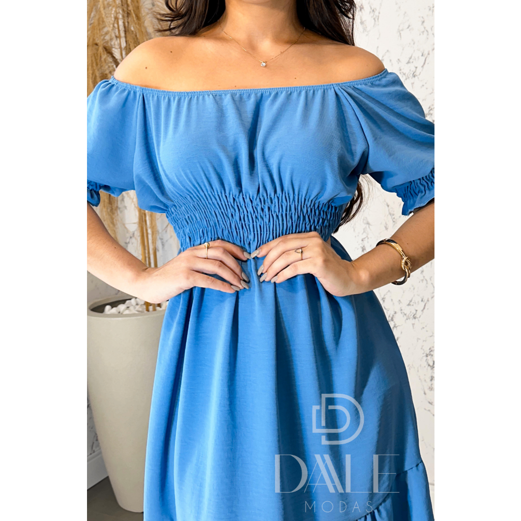 Vestido Duna Curto Midi Feminino Festa Ombro a Ombro Lástex na cintura Moda Evangélica Ciganinha