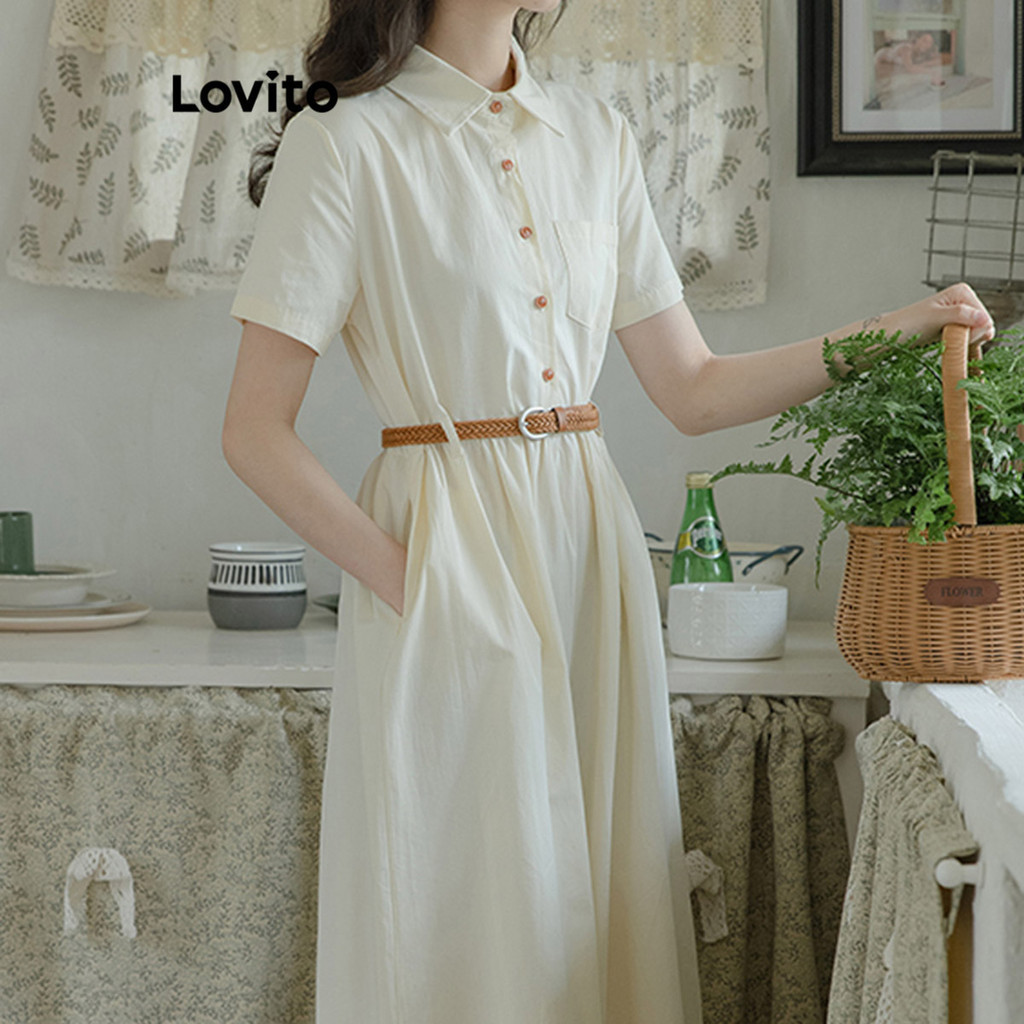 Lovito Vestido feminino casual com botão liso e bolso frontal dividido LNL72019