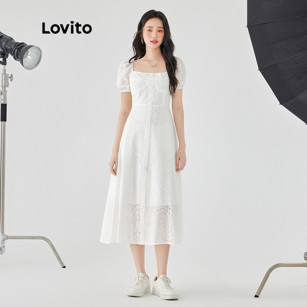 Lovito Casual Vestido Feminino Liso com Zíper Ilhó Bordado Forro e Botão Enfeitado L49AD064 (Branco)